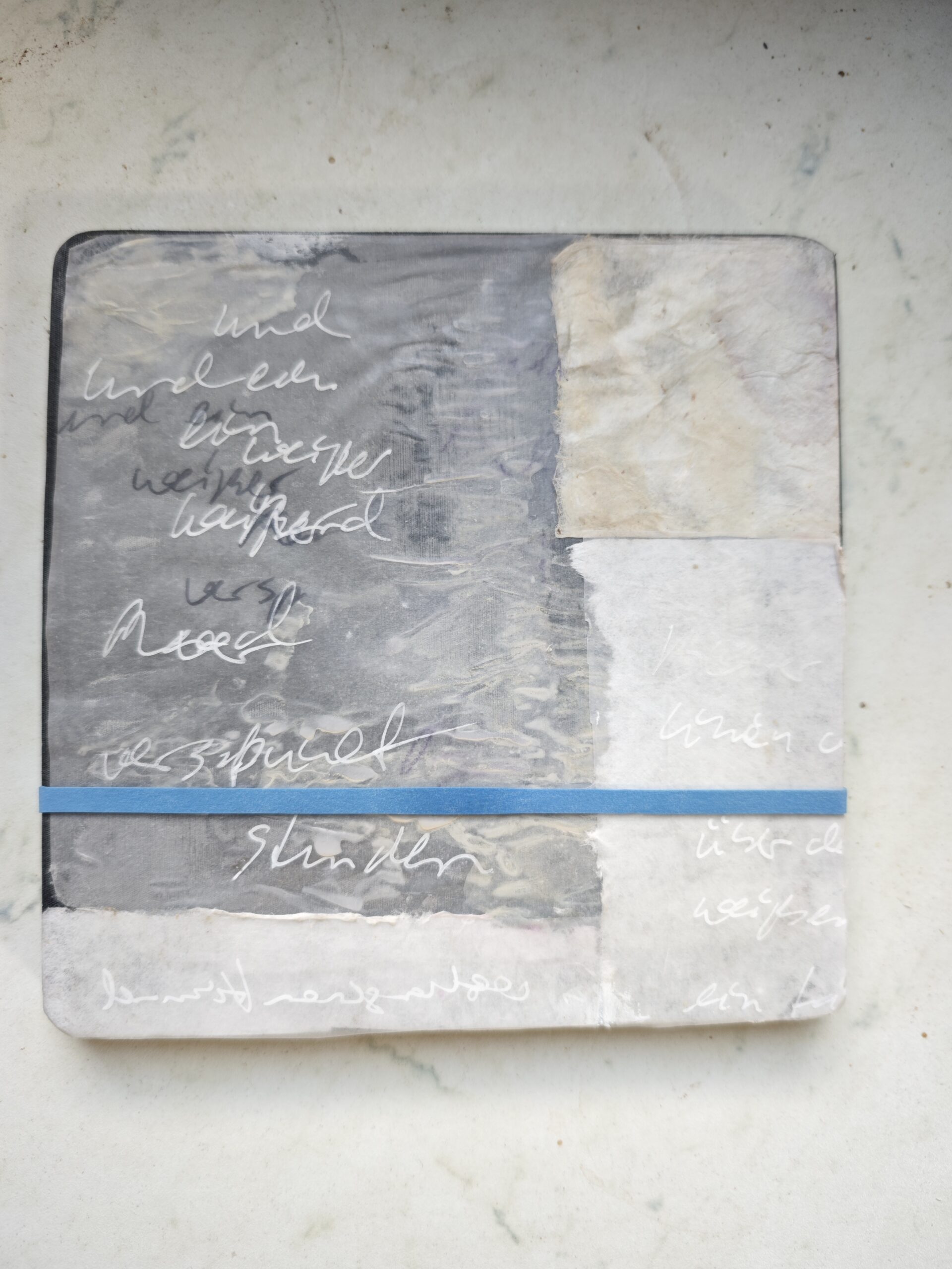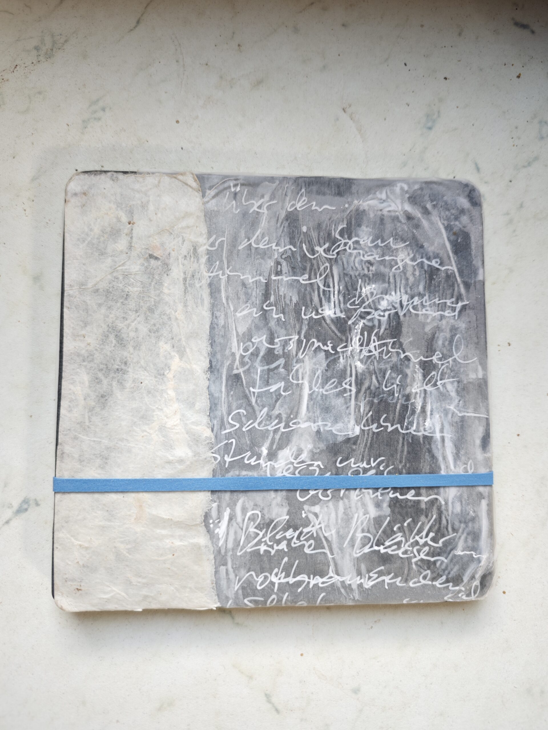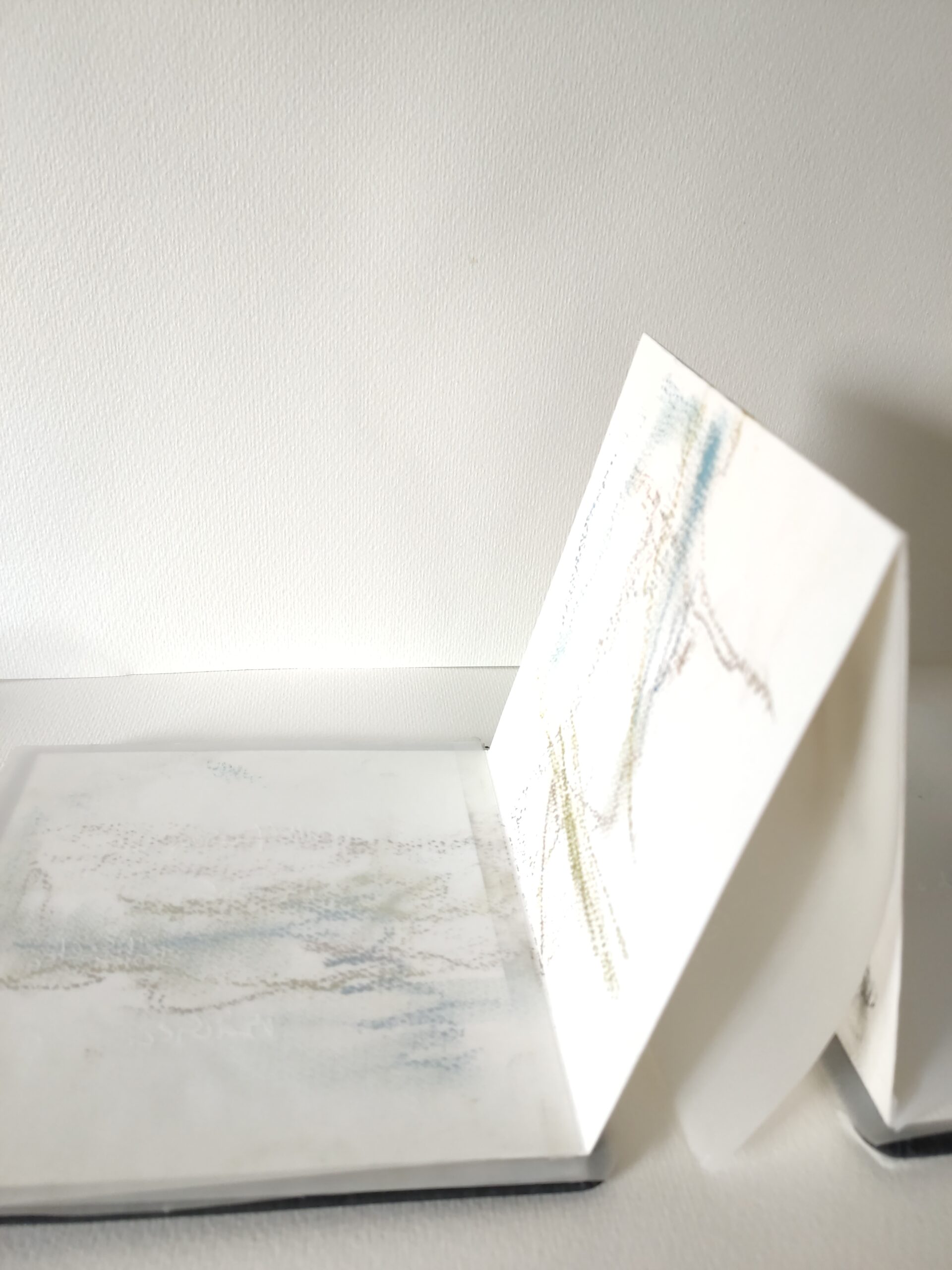 Accordion Book: Graphite on 300 gsm watercolour paper and handwritten text in ink on transparent paper, 14 x 14 cm, 5,5 x 5,5 in